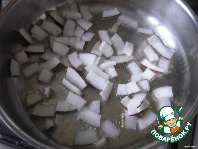В сковороде разогреть масло. Выложить кокос. Обжарить 1 мин на маленьком огне.
