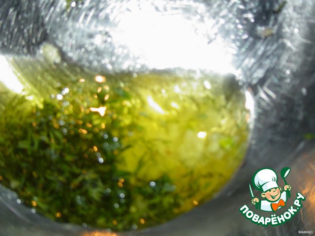 Берем домашнее подсолнечное масло, и в него выдавливаем чеснок и резанную зелень.