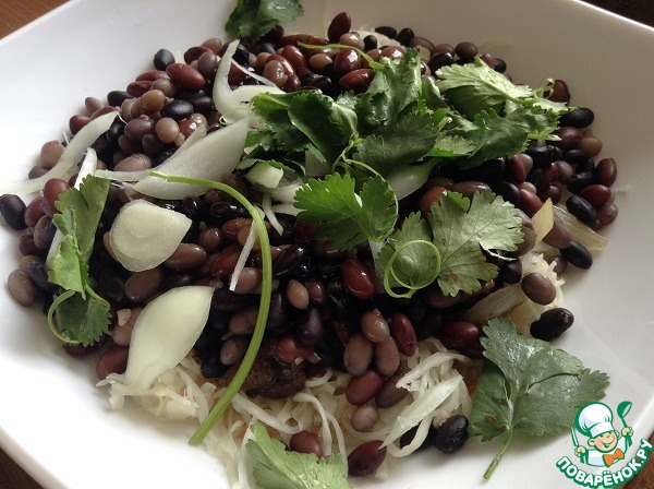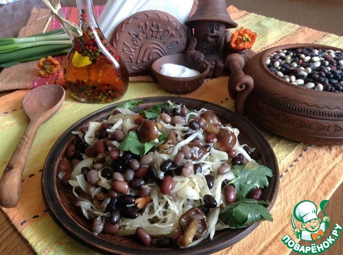 Из-за фасоли и грибов получается очень сытно, капуста придает хрусткость и свежесть, кинза вносит свой аромат ну и душистое масло объединяет и подчеркивает все вкусы.