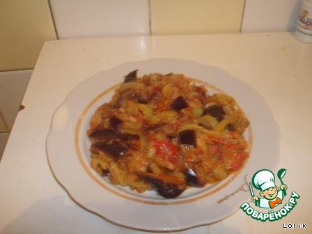 после того как все нарезается, бросаем лук в казан с раскаленным растительным маслом и припускаем лук, чтобы он был "мертвым". Далее добавляем картофель нарезанный как баклажаны по желанию и обжариваем. Далее бросаем болгарский перец после лука или картофеля и обжариваем минут 5 на сильном огне помешивая. Сразу бросаем в казан нарезанные помидоры и жарим минуты 2. И следом бросаем стручковый перец дунганский (не горький) по желанию, если его нет - то можно и без него. Далее промываем баклажаны от соли, отжимаем и бросаем в казан, обжаривая на большом огне и мешая минут 5, (если баклажаны горят, то добавляем раст. масло) далее делаем тихий огонь и закрываем крышкой казан. Тушим минут 15. Перед готовностью кладем перемолотый чеснок - 2 шт, сою жидкую. Если без сои- то солим. И готово. Приятного аппетита.