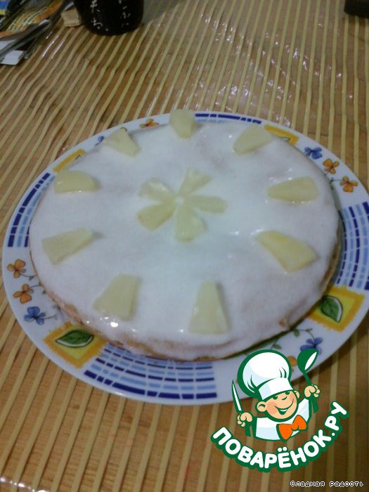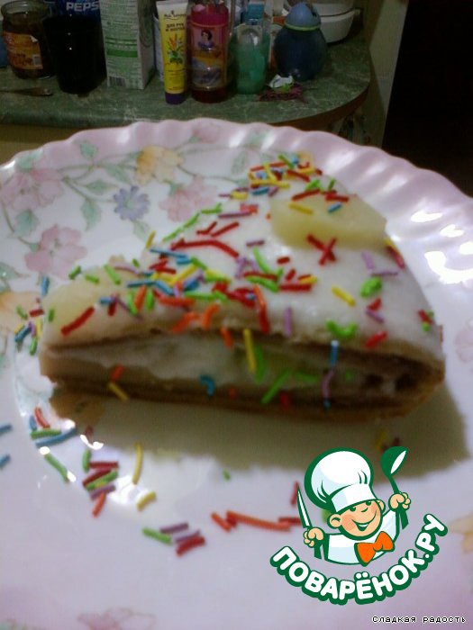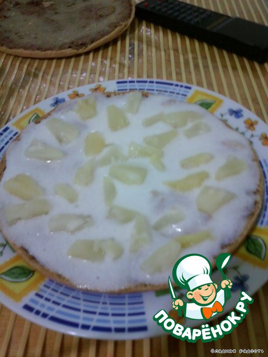 Намазать одну половину коржа и переложить фруктами( у меня были ананасы.