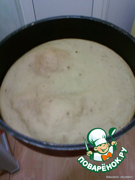 Вынуть корж и дать ему остыть,затем разрезать его на 2 части и пропитать любым вареньем или соком.