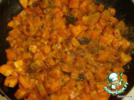 Морковь режем на четвертинки кружочков. Обжариваем на масле с добавлением тмина и карри.