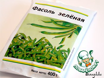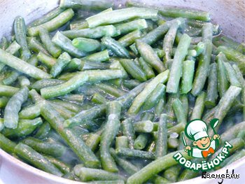 Фасоль в замороженном виде бросить в кипящую воду, отварить 10 минут и откинуть на дуршлаг.