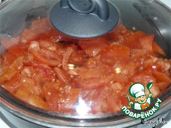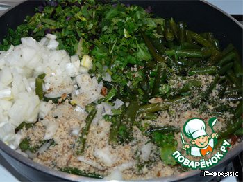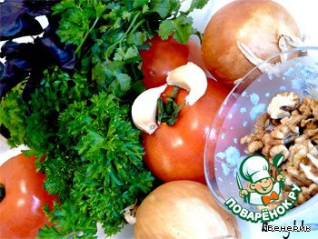 Лук мелко нарезать, добавить в сковороду к помидорам, туда же положить фасоль, орехи, чеснок, зелень. Приправить солью, черным перцем, можно для вкуса добавить сушеный чабер 1 ч.л.