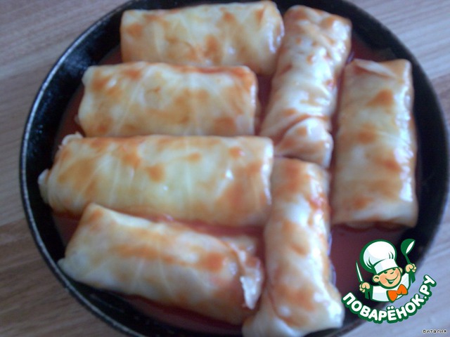 Томатный соус разводим водой (я развела 1 ложку соуса на 3/4 стакана воды), заливаем им голубцы и ставим в горячую духовку на 15-20 минут.