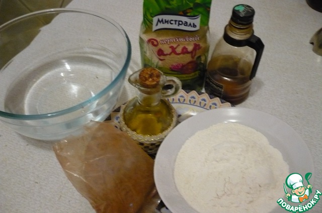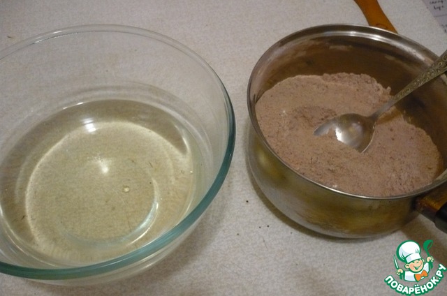 Сухие ингредиенты смешать, в другой посуде смешать воду, масло и уксус.