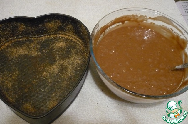 Теперь соединяем все и перемешиваем. Тесто выливать на смазанную и посыпанную сухарями форму.