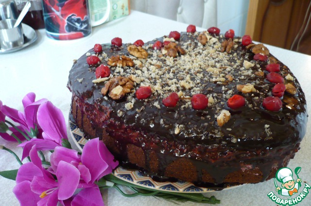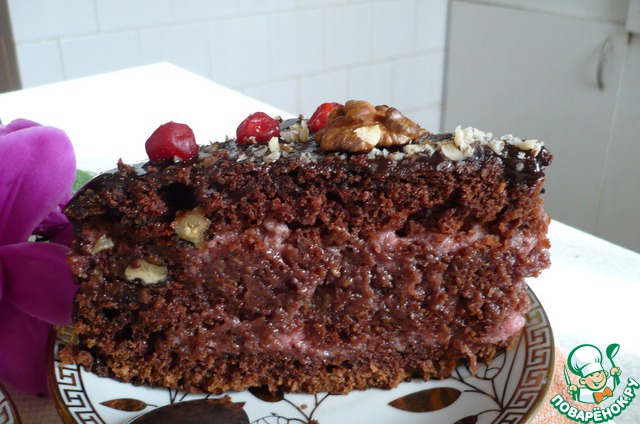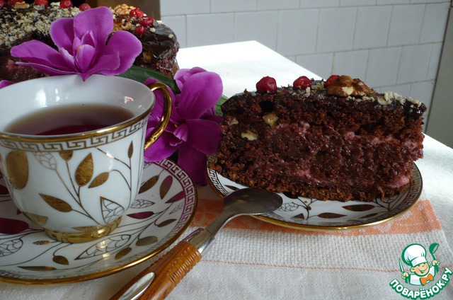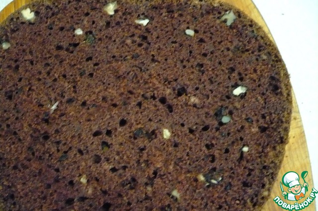 Сначала приготавливаем продукты для коржа: 3 стак. муки, 2 стак. сахара, 1/2 стак. какао, 3/4 стак. масла растительного, 2 стак. холодной воды, 2 ч. л. соды, 1 ч. л. соли, 2 ст. л уксуса, грецкие орехи (оставить немного на украшение ), ванилин 1 ч. л.