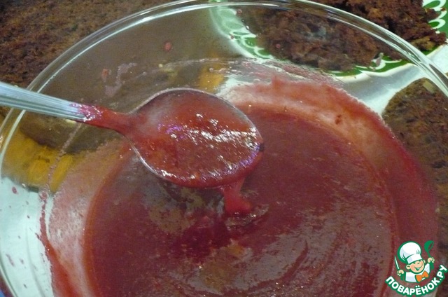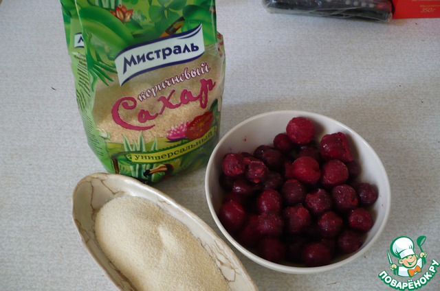 Пока печется корж, мы готовим мусс. Подготавливаем продукты: 200 гр вишни, 450 гр. воды, 200 гр. сахара, 4 ст. л. манки.
