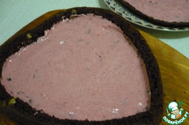 Вынутые кусочки коржа уложить на дно шкатулки в 1 слой и промазать муссом. Затем следующий слой и т. д. Последний промазываем муссом. Закрыть крышкой.