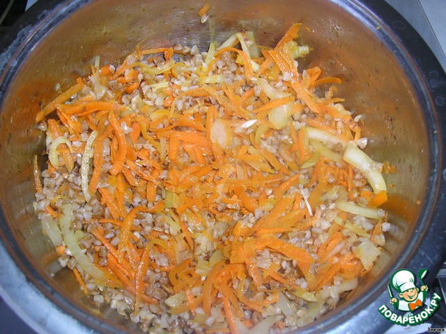Варим гречневую кашу, смешиваем кашу и обжарку.