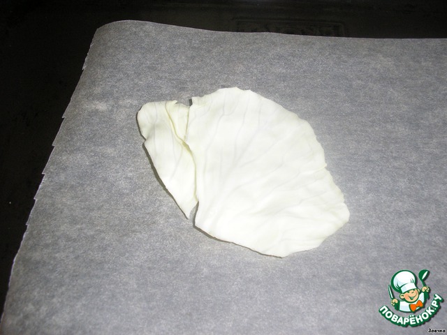 Противень застилаем бумагой для выпечки, кладём самый маленький капустный листок.