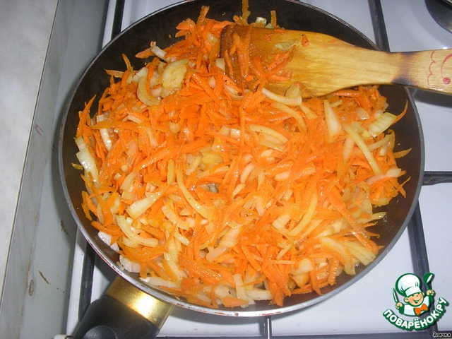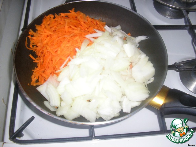 Трём на тёрке морковку, мелко режем луковицу, отправляем на сковороду.