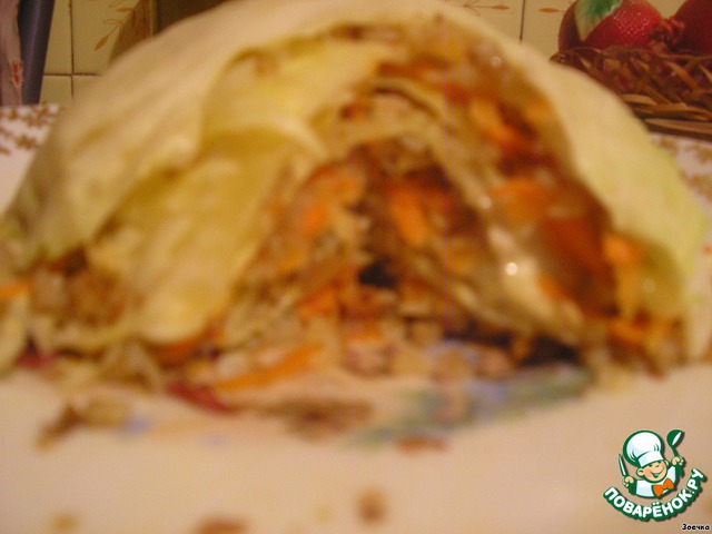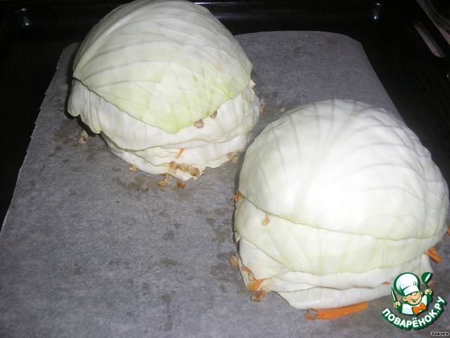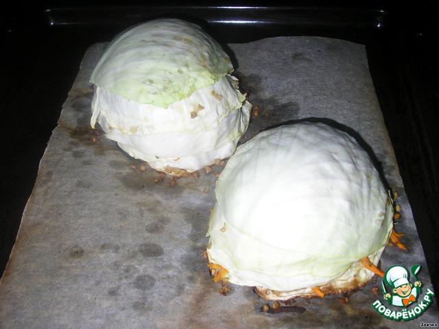 В итоге получается нафаршированная половинка капустки.У меня получилось 2. Отправляем в нагретую духовку на 10 минут. Раньше использовали русскую печку.