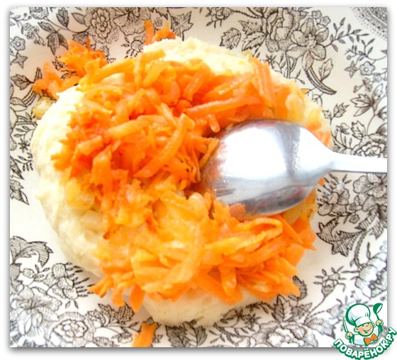 В картофельное тесто выкладываем половину обжаренной моркови и лука, вымешиваем, если есть необходимость, добавляем еще немного муки.
