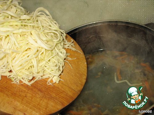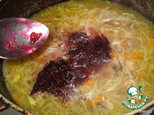 Свеклу (у меня была уже вареная) натереть на терке и добавить в бульон.