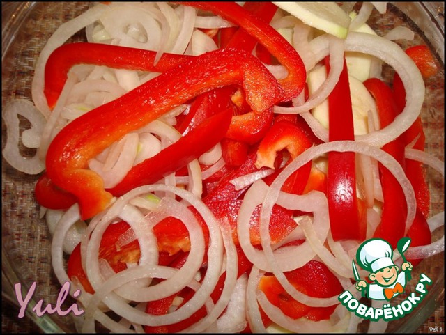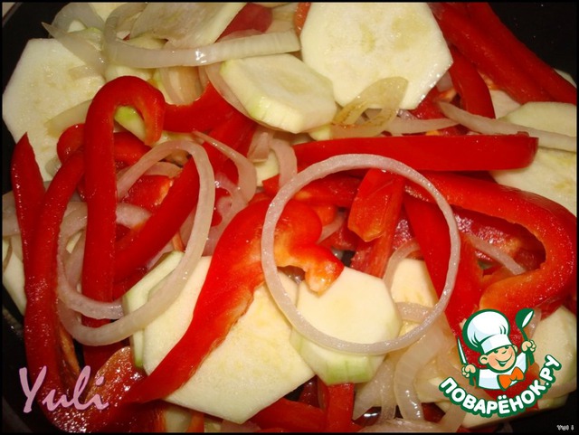 Цуккини нарезать кружочками, сладкий перец - полосками.