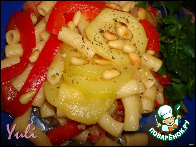 | Есть обычные макароны как-то неинтересно и скучно. Вот и придумался этот рецепт. Необычный вкус и аромат этому блюду придает бальзамический уксус, а кедровые орешки - пикантность. От души советую попробовать даже тем, кто пост не соблюдает. Это вкусно, ароматно и просто красиво. К конкурсу "Постимся с Moulinex" |