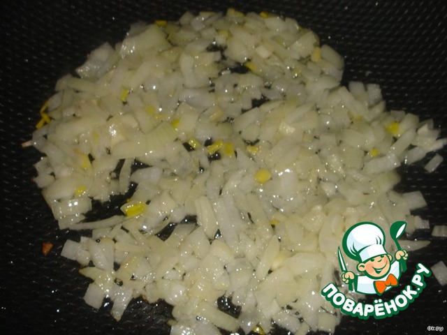 Лук измельчить и обжарить на растительном масле 5 минут.