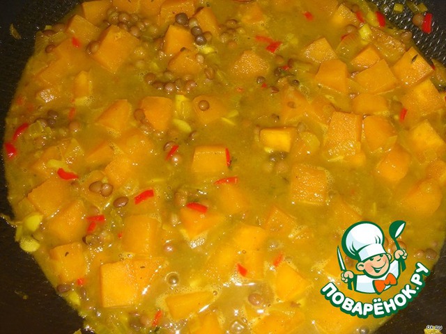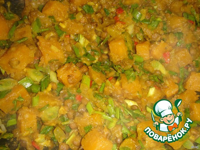 | Нежное, пряное рагу из тыквы и чечевицы. Можно готовить как самостоятельное блюдо, а можно подавать в качестве гарнира. Готовится довольно быстро и получается очень вкусное блюдо. Рискну выставить его на конкурс "Постимся с Moulinex". |