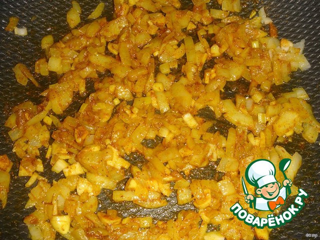 Добавить чеснок и карри, обжаривать 30 сек, постоянно помешивая.