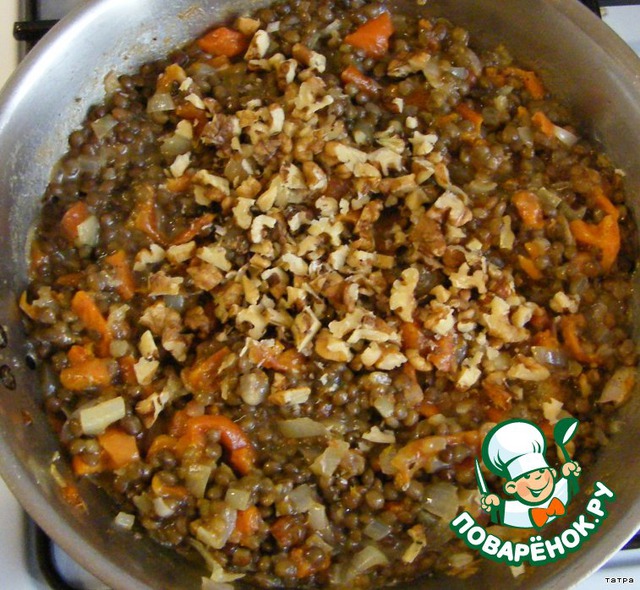 Положить чечевицу к кураге и луку и немножко потушить(2-3 мин).Добавить грецкие орехи,перемешать.