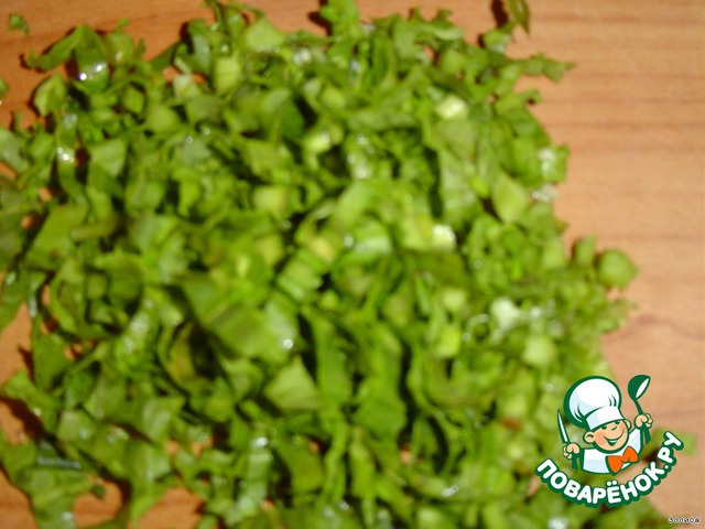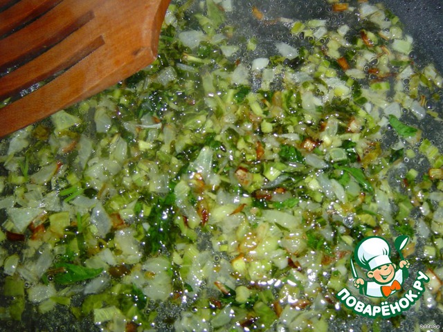Спассеруйте на масле лук, добавьте чеснок, шпинат, немного воды и тушите 5 минут.