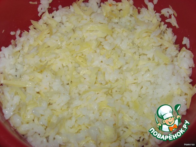 Затем сверху оставшийся рис. Заливаем яйцами с молоком.