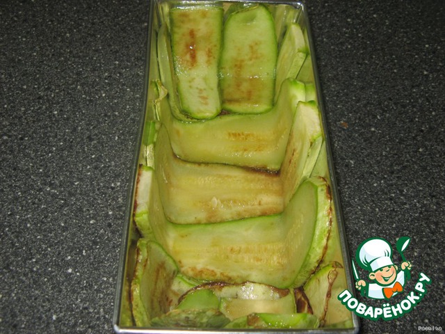 Кабачок нарезать вдоль. Обжарить с двух сторон на растительном масле.
