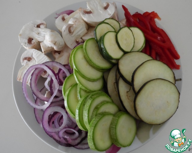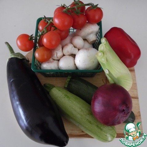 Пока тесто подходит, займёмся начинкой. Нам понадобится -мало оливковое 10мл, соусом "Териаки"2ст. л, цуккини 1шт, кабачок 1шт, баклажан 1шт, перец сладкий 1шт, помидоры черри 5штук, фенхель 1шт, лук красный 1шт, грибы шампиньоны 10шт, чеснок 2 зубика, перец острый.