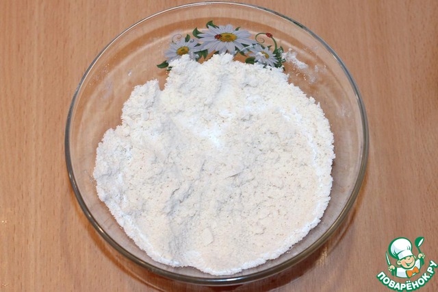 В миску с холодным маргарином или сливочным маслом, нарезанным кубиками или стружкой всыпаем муку.