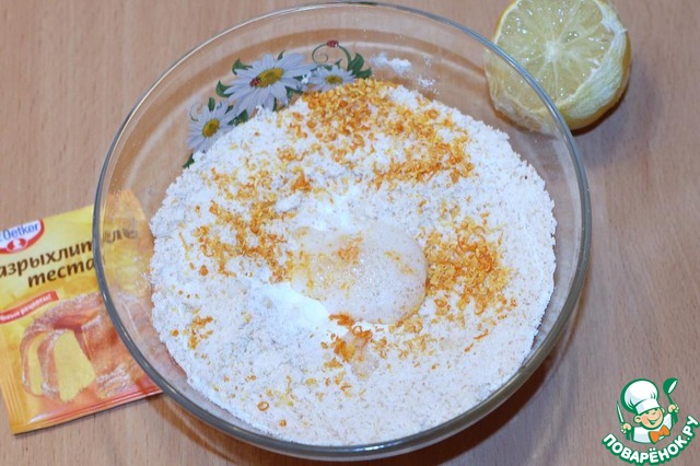 Теперь в смесь добавляем разрыхлитель, цедру лимона, сок и 1 ст. л. воды. Вымешиваем тесто и, если возникнет необходимость, можно добавить еще немного воды.