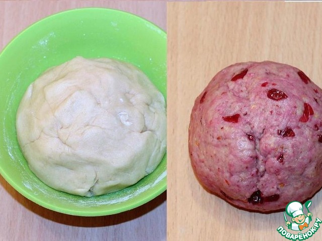 У меня ягода замороженная. Я разделила тесто на 2 части. В первую часть я добавила половину ягоды и + 2 ст. л. муки, а во вторую ничего не добавляла. Оба теста по отдельности я скатала в шар и отправила в холодильник.