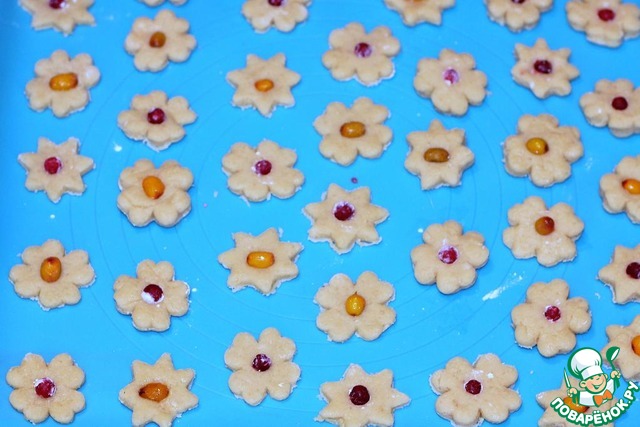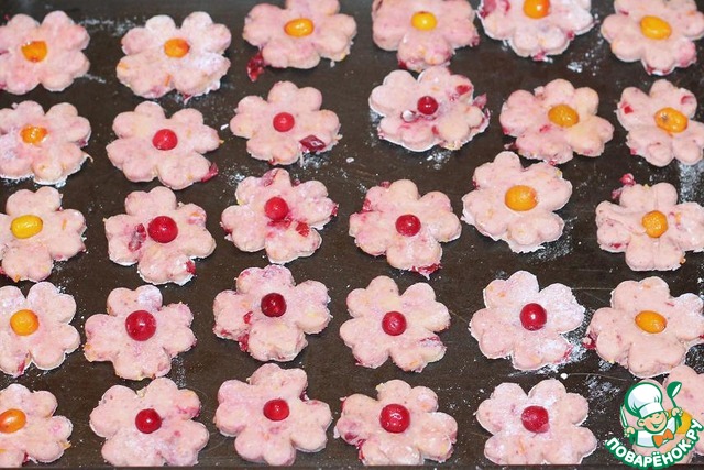 Вырезаем формочкой печенюшки, приминаем немного серединку и кладем ягоду. Выкладываем печенье на смазанный противень и запекаем в духовке, разогретой до 180 С 15-20 мин. до появления золотистого цвета у печенюшек.