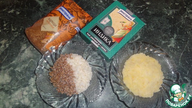 Пропускаем через мясорубку гречку, рис, луковицу, добавляем картофельное пюре, аджику (или другие специи, привычные Вам в приготовлении котлет), выдавливаем чесночок, крошим зелень. Тщательно все перемешиваем.