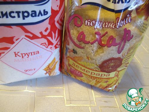 Для приготовления десерта использовала коричневый сахар, смолотый в пудру, и крупу манную от Мистраль.