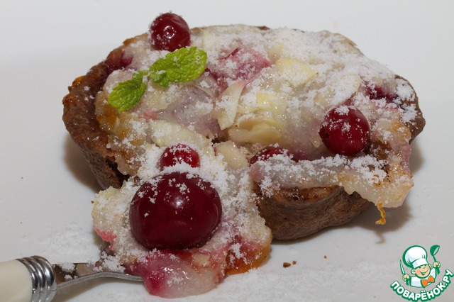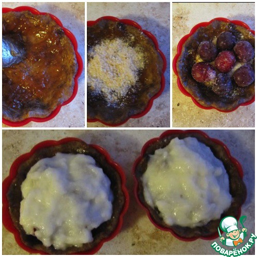 Если в тесто добавить какао-порошок пару ложек (кол-во муки уменьшить!), то можно приготовить корзиночки. Выложить форму тестом, донышко смазать джемом, посыпать постными молотыми сухарями, выложить ягоды (вишню), залить муссом и выпекать в духовке 10-15 минут до готовности теста!