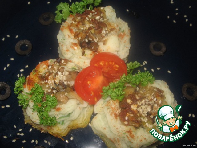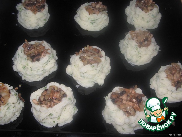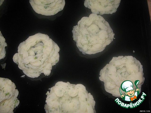 Картофельное пюре кладём в кондитерский шприц и высаживаем на смазанный растительным маслом противень в виде волованчиков (у меня такая ассоциация была).