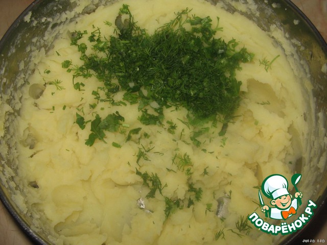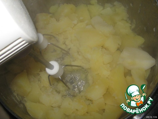Отварить картофель в подсоленной воде. Размять, добавив немного жидкости, в которой варился картофель, и немного растительного масла.