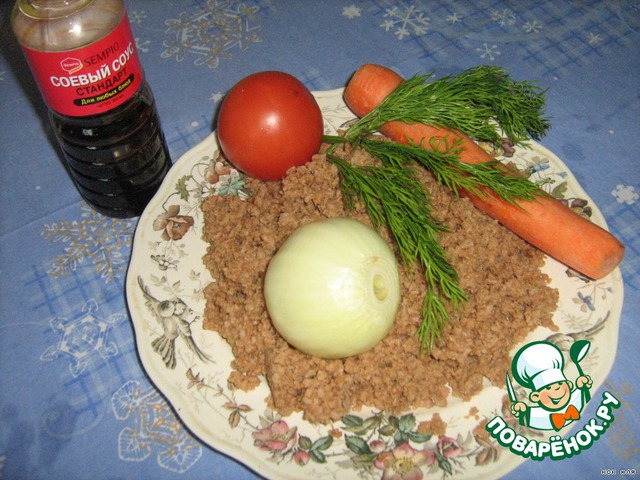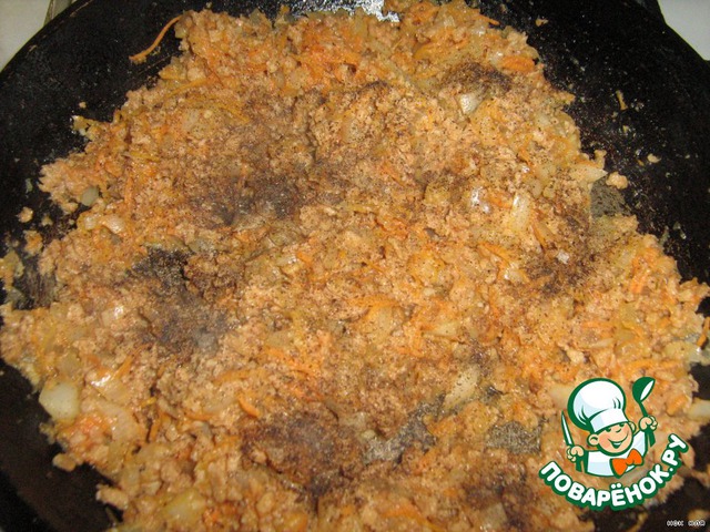 Обжариваем лук ,морковь, фарш,чеснок,соевый соус,перец .