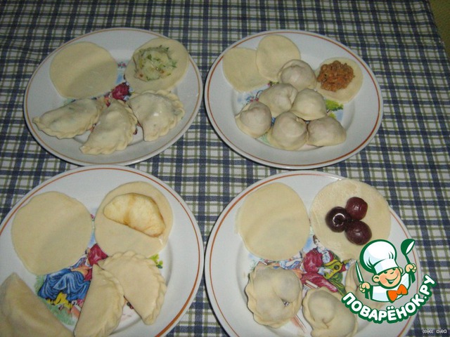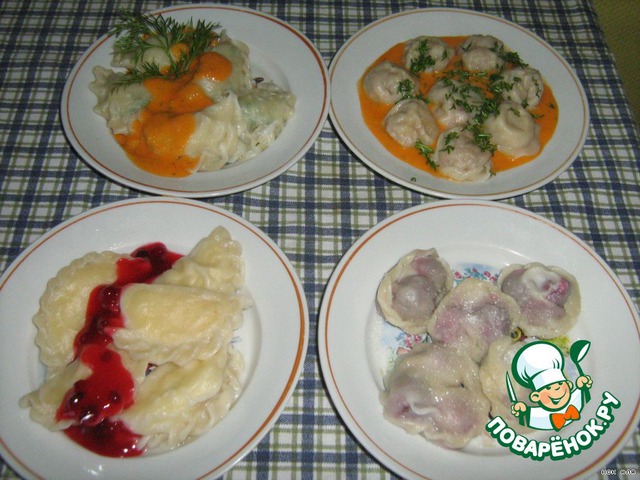 Тесто приготавливаем . Муку разводим смесью из теплой под соленой воды с добавлением растительного масла ,Оно должно быть крутым и эластичным .Формуем пельмешки и вареники .