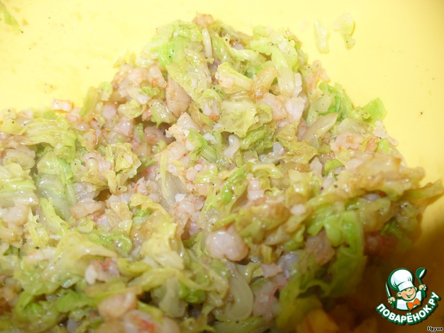 Смешиваем креветки и китайскую капусту, перчим по вкусу, подсаливаем соевым соусом, тоже по вкусу.