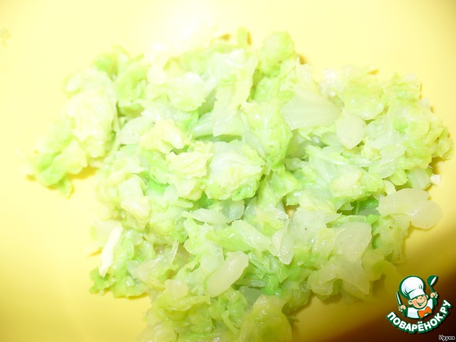 Начинка. Поставить закипать воду в 2-х кастрюльках. Китайскую капусту крупно нарезать.