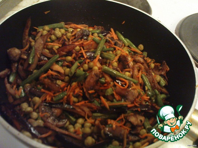 Снимаем морковку обжариваем горошек быстро (он не должен быть сухим ). Достаточно немного золотистого цвета.