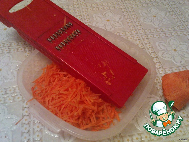 Пока фасоль обжаривается трем на "корейско-морковной" терке морковку.Снимаем фасоль, обжариваем морковку