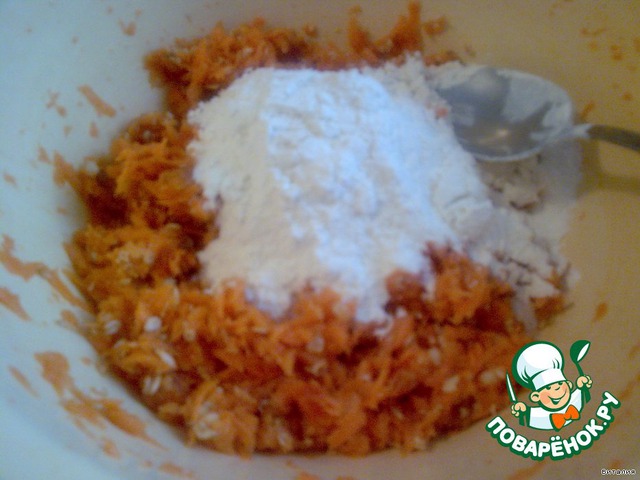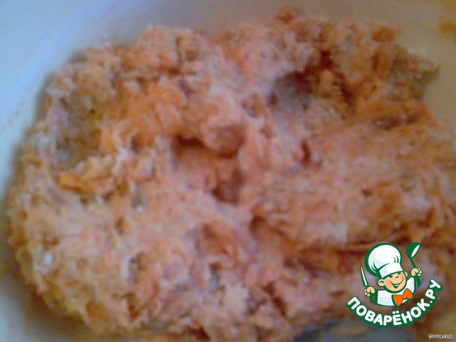 Смешать тертую морковь, распаренный геркулес, нарезанную курагу, добавить сахар, муку.