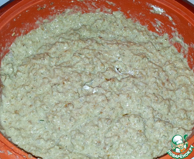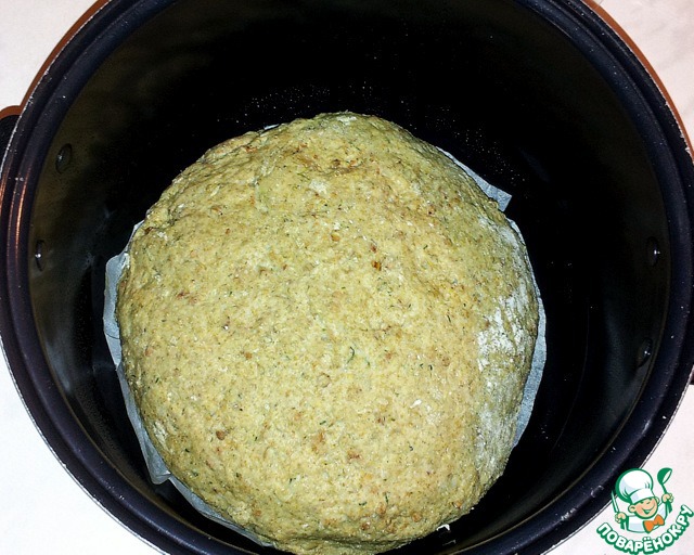 Через 30 минут тесто поднялось и я подмесила ещё по 150 г ржаной и пшеничной муки = 300 г. Насыпала сухую зелень для аромата.