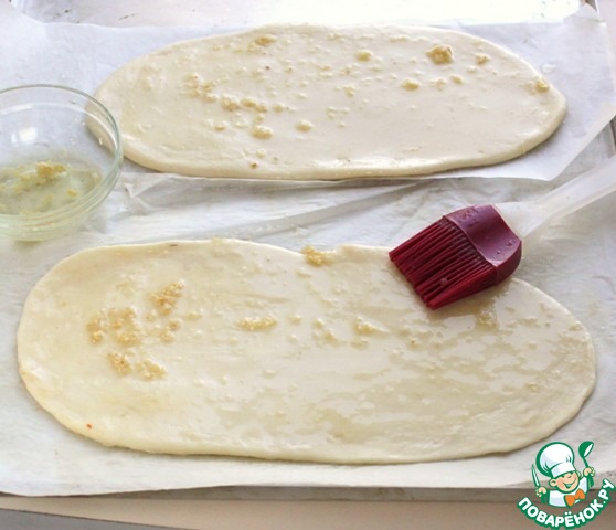 Итак, разделим тесто на 4 части и каждую раскатаем. Выложить лепешки на противень. Смазать тесто чесночным маслом.