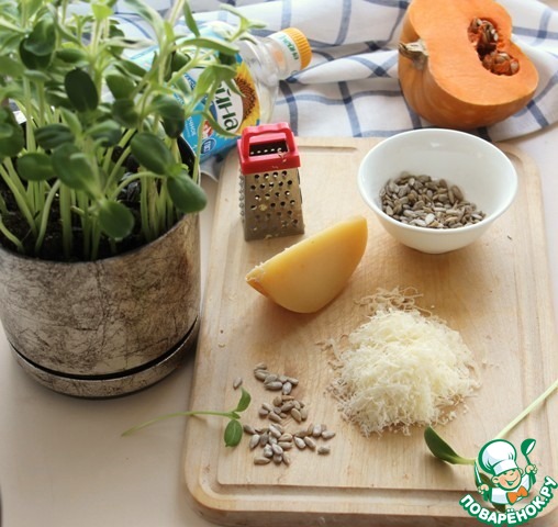 Готовую лепешку посыпать любимой зеленью. С тыквой хорошо сочетается руккола, базилик. Я подавала с ростками подсолнуха.
